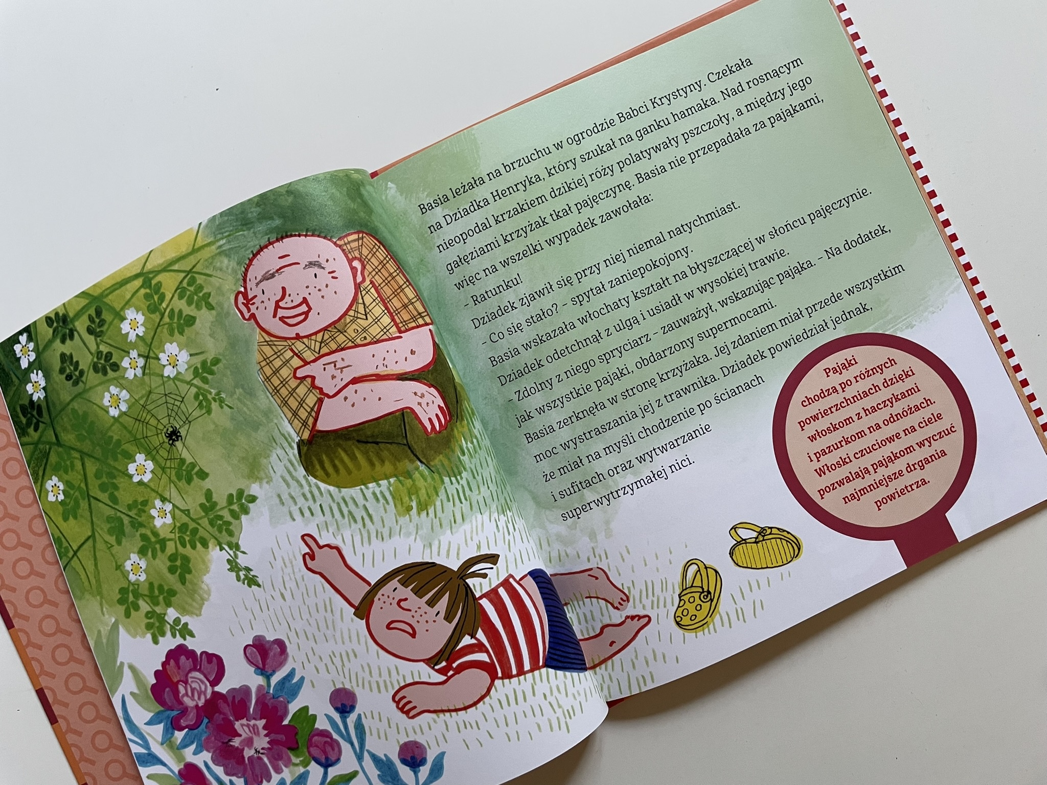 Wiedza nie jest tu narzucona – wynika naturalnie z pytań zadawanych przez Basię, co czyni ją jeszcze bardziej przystępną. Dziewczynka początkowo boi się pająków, jednak dziadek pomaga jej spojrzeć na nie z innej perspektywy – pokazuje, jak są silne, pracowite i jak niesamowite rzeczy potrafią robić.